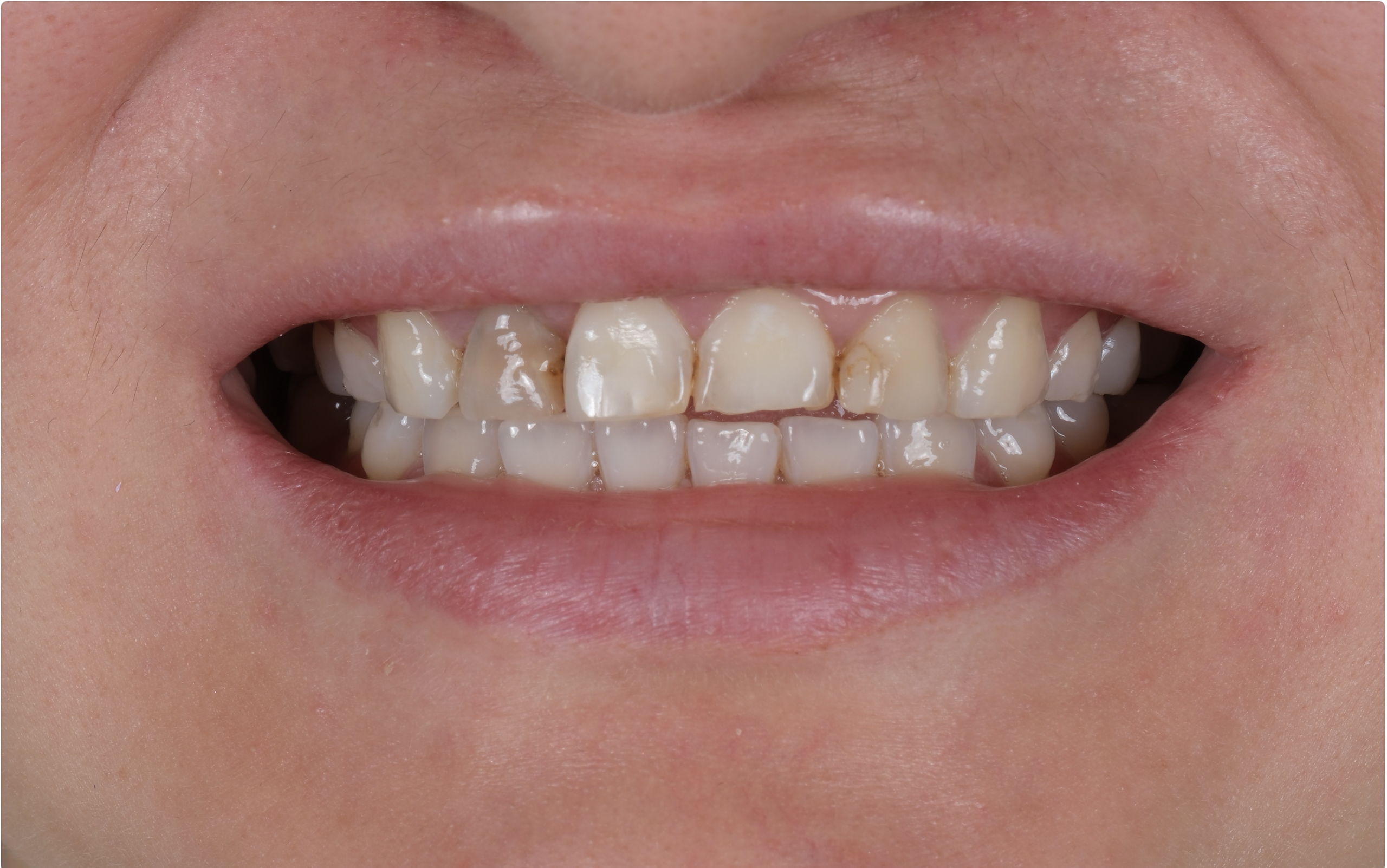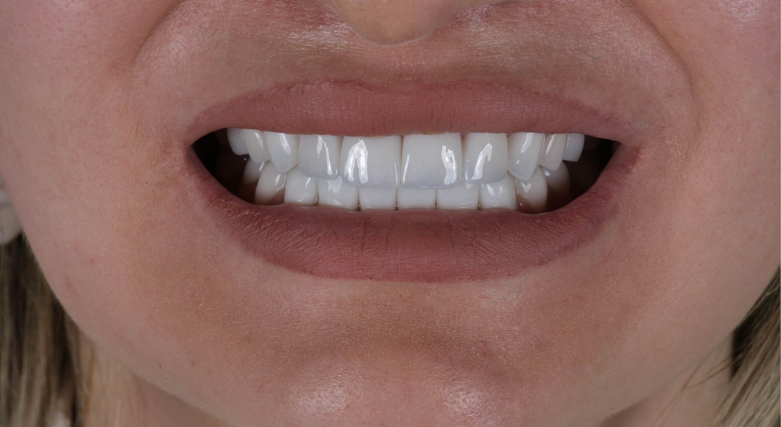 Old PFM crowns were replaced due to dark margins and poor colour match. Ten teeth were prepared on day two, and final ZirCAD Prime crowns were cemented on day five. Shade and contour were verified with the patient before final cementation. No dark gum lines with the new material.