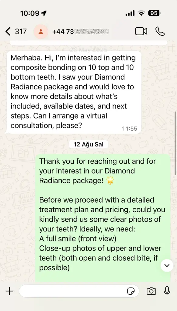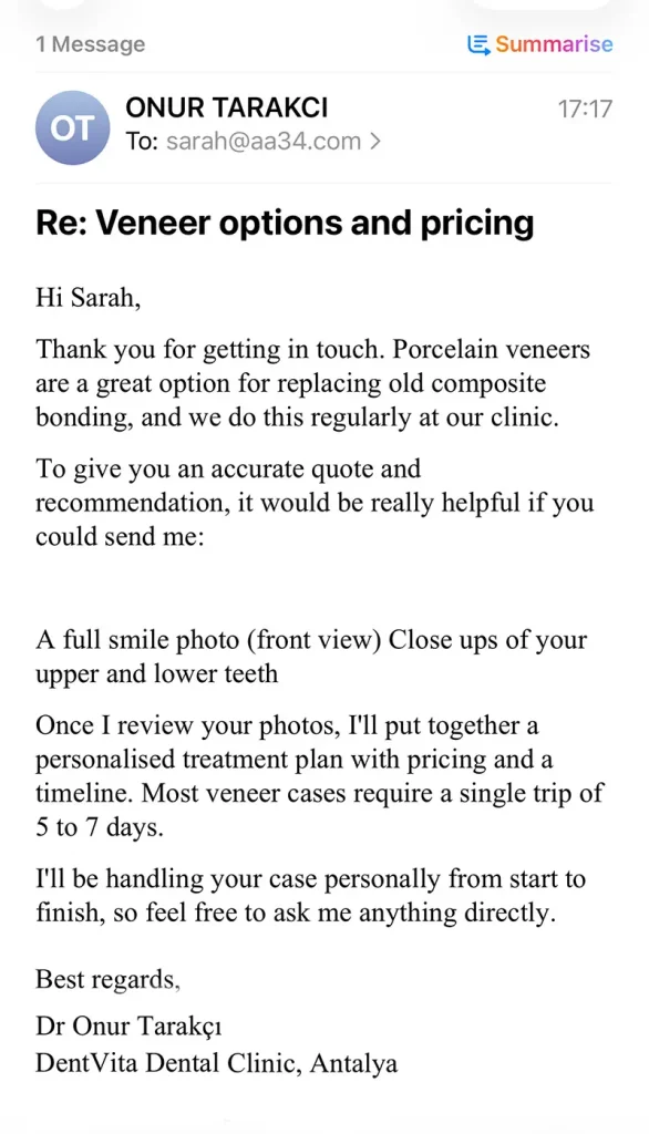 In many clinics, your message goes through a coordinator who decides what the dentist needs to hear. At DentVita, our team replies in clear English from day one, but your treatment plan comes directly from Dr. Onur. He reviews your photos, explains your options on a video call, and answers your clinical questions himself. No one interpreting your case between you and your dentist.