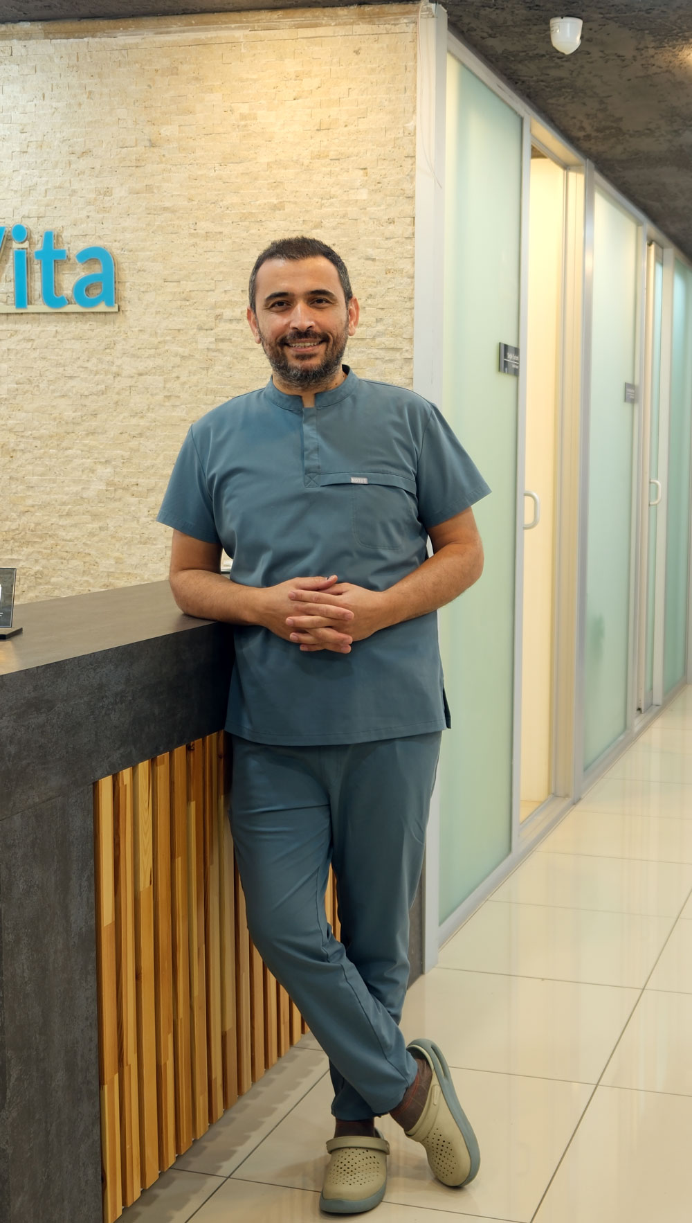 Today his focus at DentVita is aesthetic dentistry: veneers, composite bonding, and implant-supported restorations. He speaks fluent English, Turkish, and Russian, with working German.