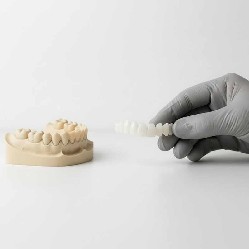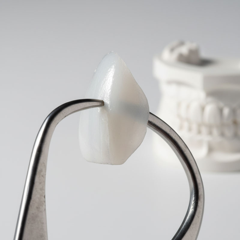 Tooth-coloured resin layered and polished in a single visit. Minimal prep when your teeth allow it. From €140 per tooth.