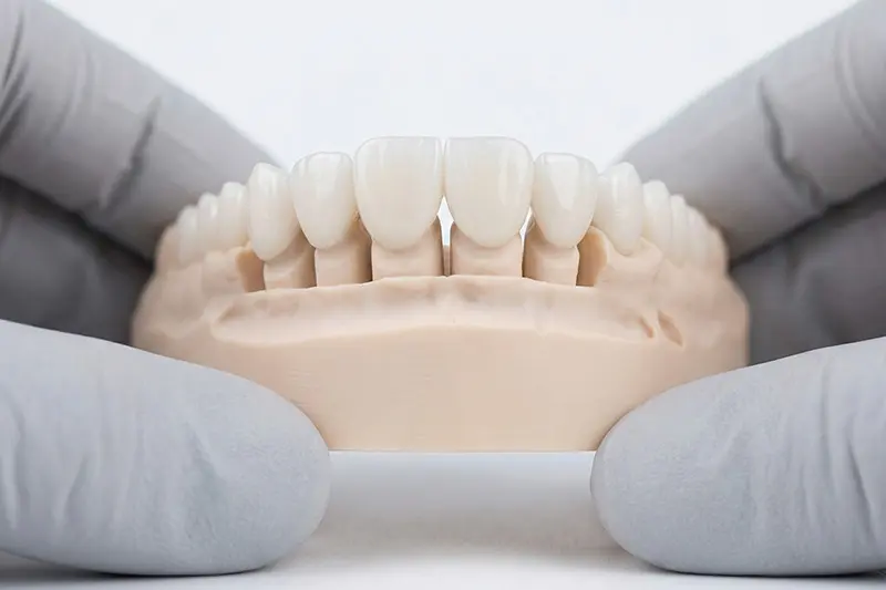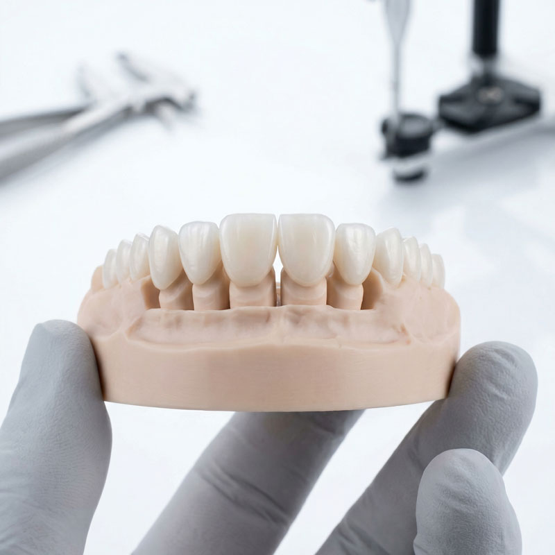Monolithic zirconia milled from a single block. Stronger than PFM, no dark gum lines, and a natural look that holds. From €200 per crown.